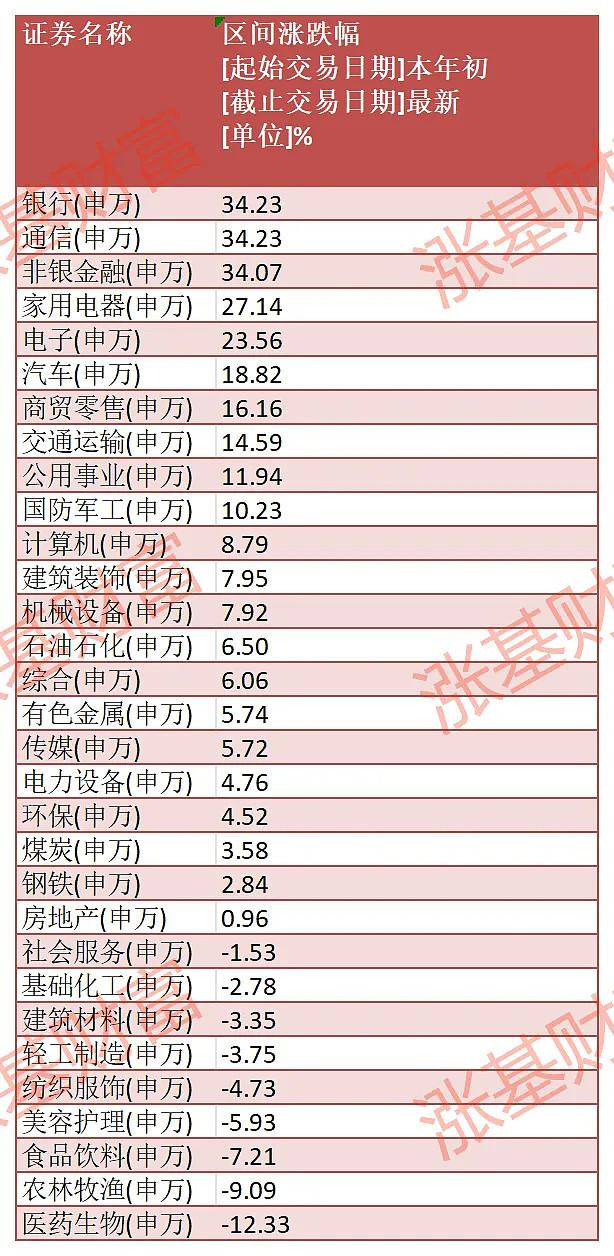 行业板块内部,银行、通讯、非银金融本年的涨幅都逾越了34%,家用电器、电子、汽车、商贸等板块进展也都相比好。